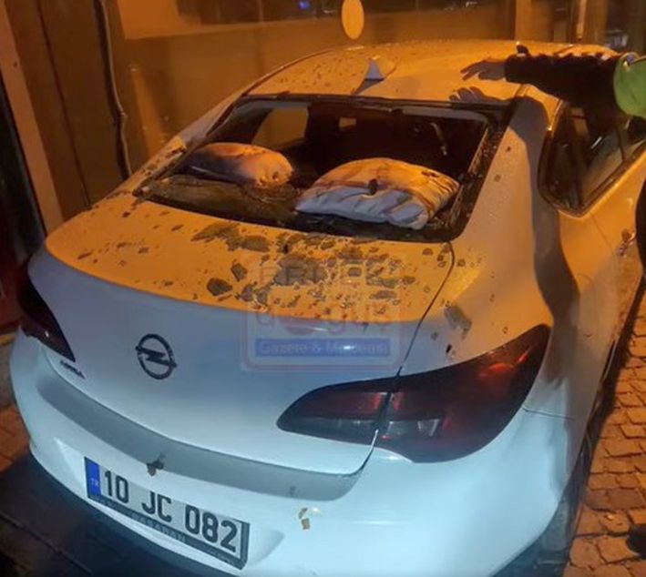 Deprem sırasında Erdek Yalı Mahallesi Yasemin Demiray Sokak’taki bir apartmanın üst katından depremin etkisiyle dökülen beton sıva, park halindeki 10 JC 082 plakalı aracın üzerine düştü. Önce şiddetli fırtına ve yağmur, ardından da yaşanan deprem sonrasında vatandaşlar kısa süreli tedirginlik yaşadı. (haber/foto: İbrahim Şahin)