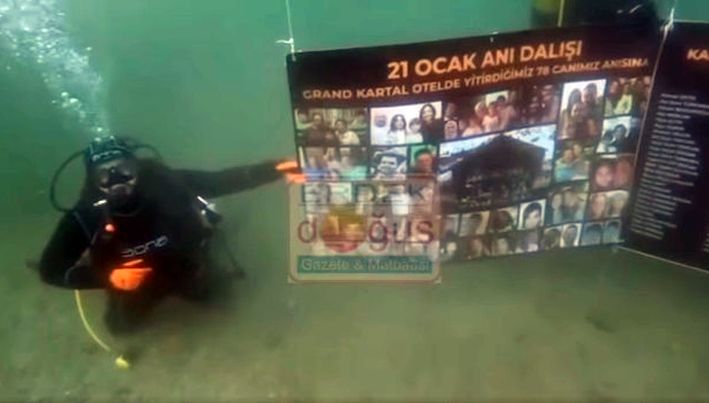 Bolu Grand Kartal Otel yangını faciasında hayatını kaybeden 78 kişinin fotoğrafları ve isim lisletisinin bulunduğu afişleri suyun 10 metre altına inerek afişleri açan Erdekspor Dalış Külübü ekibi; “Bu faciada yitirdiğimiz aileleri anmak ve unutmamak amacıyla o acı günün anısına bu eylemi gerçekleştirdik. Hepsini rahmetle anıyoruz” dediler.