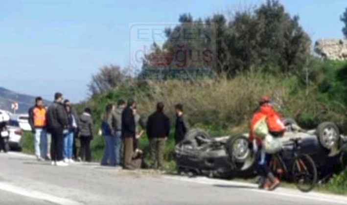 (Erdek Doğuş) – Komşu ilçe Bandırma’dan Erdek istikametinde gelen araç, Erdek tarafında Tatlısu kavşağından sonraki keskin virajda savrularak karşı şeridin şarampolünde takla attı.