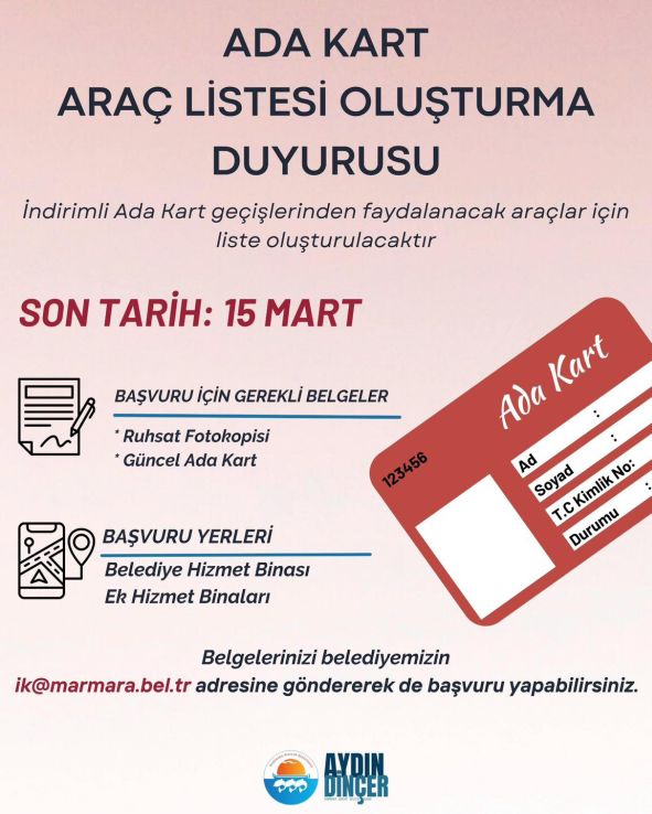 Marmara Adalar Belediyesi, özellikle adalarda yaşayan araç sahiplerinin mağduriyet yaşamaması için başvuru ve güncelleme işlemlerini son güne bırakmamaları gerektiğini vurguladı. Süreçle ilgili ayrıntılı bilgilere ise belediye tarafından hazırlanan duyuru afişlerinden ulaşılabileceği bildirildi.