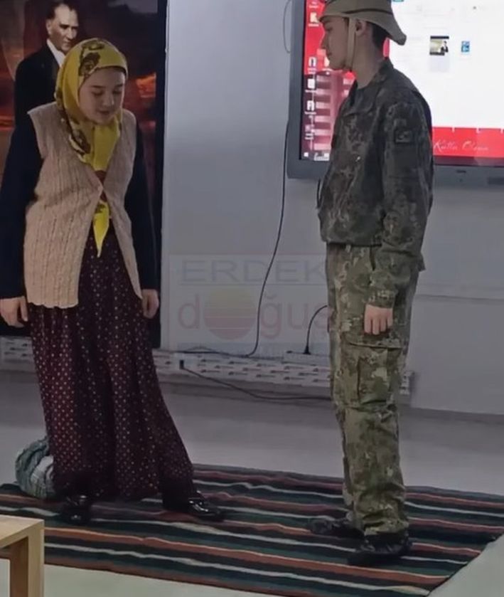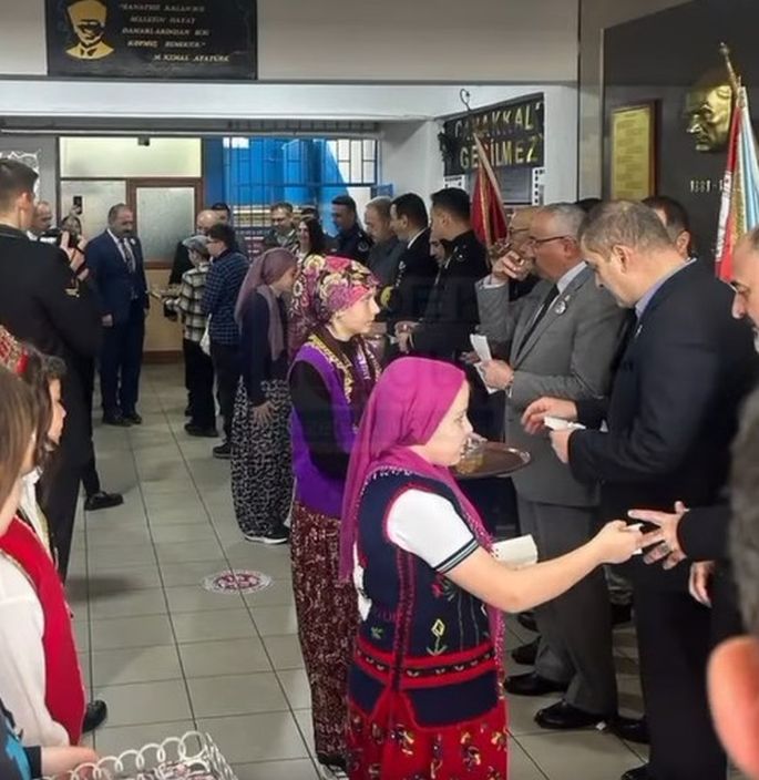Program, Okul Aile Birliğinin hazırladığı şekersiz üzüm hoşafı, kuru ekmekten oluşan asker menüsünün protokole ikramı yapılarak karşılamayla başladı. Daha sonra, Onbeşlilerin selamlaması ile protokol tören salonunda yerlerini aldı. Erdek Kaymakamı Hasan Göç, Garnizon Komutanı Abdülyener Gecikli, Belediye Başkanı Burhan Karışık, Daire Amirleri ve beraberindeki misafirlerin katılımı, saygı duruşu ve İstiklal Marşı’nın okunmasıyla tören başladı.
